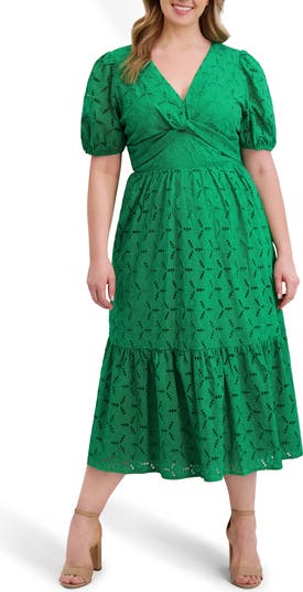 Embroidered eyelets lend textural intrigue to a charming midi dress cut from pure cotton for a crisp yet breathable feel.