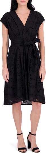 Airy eyelet embroidery accentuates the charm of this soft cotton dress cinched with a tie-waist belt and framed with abbreviated sleeves.
