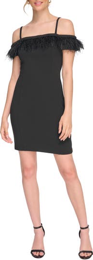 Plumes of whimsy feathers further the party vibes of this off-the-shoulder minidress that's cut from soft crepe fabric.