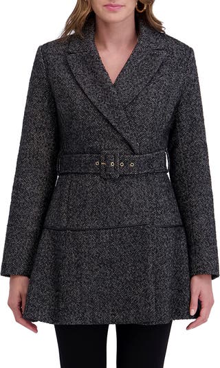 A classic herringbone pattern and belted waist enhance the polished style of this warm, woolly coat fashioned in a chic flared silhouette.