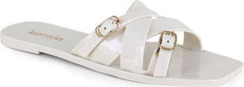 Buckled hardware illuminates the crisscrossing straps atop a summery slide sandal instantly modernized by a sleek, squared toe.