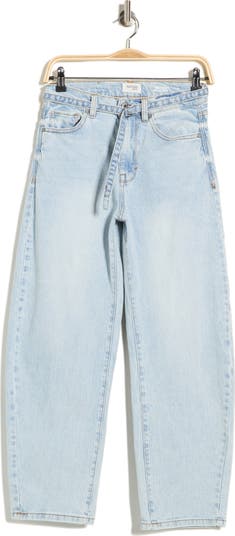 A removable belt highlights these barrel-leg jeans cut from faded cotton-blend denim in an ankle-skimming silhouette.