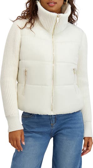 Brave the cooler seasons in this cloud-like jacket fashioned with cozy knit sleeves and a quilted core to keep you warm.