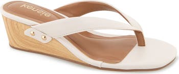 A wood-like heel brings a retro flourish to a summery sandal secured by simple straps crafted from smooth faux leather.