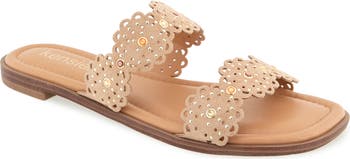 Two laser-cut floral straps studded with gleaming stud accents elevate the breezy charm of this sun-ready slide sandal.