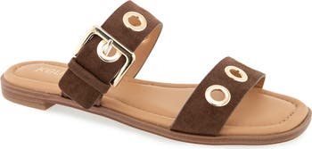 Polished grommets and buckle hardware illuminate the dual straps atop a summery slide that delivers a dose of shine to everyday looks.