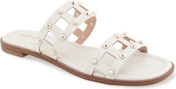 Two laser-cut geometric straps studded with gleaming stud accents elevate the breezy charm of this sun-ready slide sandal.