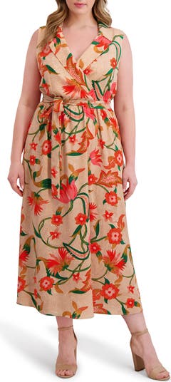 A matching tie snatches the waistline of a woven midi dress defined by a rich texture and bold floral print.
