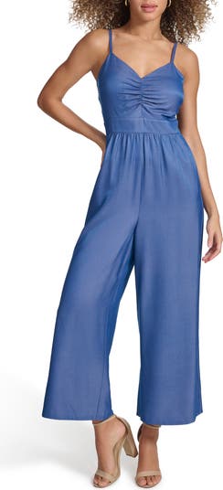 A simple gather around the waist gives shape to this loose-fitting jumpsuit that is designed with wide legs and a shoulder-baring neckline.
