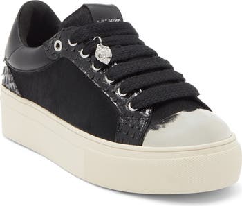 A chunky platform adds on-trend appeal to a low-profile sneaker made with soft leather overlays and genuine calf hair for an elevated look and feel.