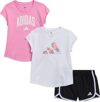Branded graphics and 3-Stripes detailing bring heritage charm to a pair sporty T-shirts and shorts set that has your budding athlete ready for gameday.