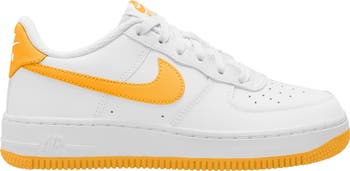 The basketball shoe that started a sensation keeps on shooting and scoring as a sneaker reissued for smaller feet that want to kick around in bigger style. The iconic Air Force 1 sole sports embedded Nike Air cushioning and crenellations along the tread that frame a star-studded bumper toe.