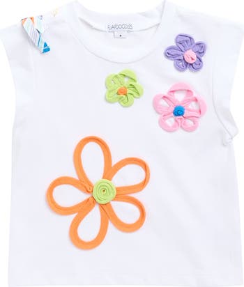 Playful appliquès and a bow at one shoulder bring sweet dimension to this cotton-blend T-shirt your kiddo will love.