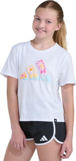 Your growing athete will love the soft jersey comfort of this cute T-shirt featuring a colorful, floral-inspired Badge of Sport logo graphic.