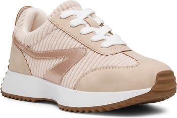 Swooping overlays add a retro-inspired element to a sporty low-top sneaker set on saw-edge sole for a track-style finish.