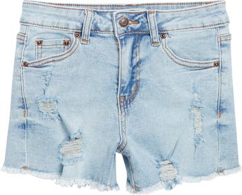Upgrade their sunny staples with these cute denim shorts that feature framed hems and distressed accents.
