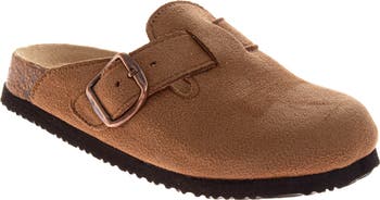 A wide buckle is interwoven at the opening of this kid-approved clog featuring a cushioned footbed.