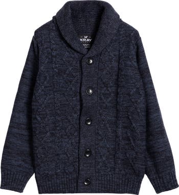 A chunky cable knit design and oversized tonal buttons define a cardigan that is sure to keep them cozy.