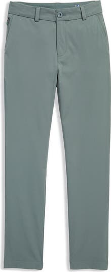 Stretchy, sweat-wicking fabric keeps your kid looking smart and staying comfortable in flat-front chinos made with front and back pockets plus a hidden zip pocket on one side.