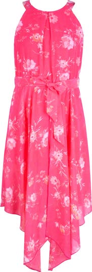A floral chiffon dress with a halter-neck and handkerchief hem is perfect for sunny days and special occasions.