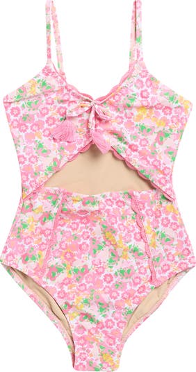 Your kid will be ready for sunny pool days in this vibrantly printed one-piece sweetened with a front cutout detail at the waist. Zigzag stitching prevents bunching for all-day comfort.