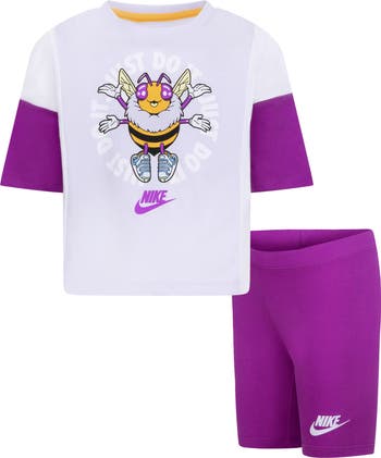 Your little champion will be comfy and cute in this sporty ensemble featuring graphic T-shirt paired with coordinating bike shorts.