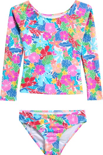 A tropical floral pattern brings playful charm to this two-piece rashguard swimsuit that's sure to be a beach-day win your kid swimmer will love.