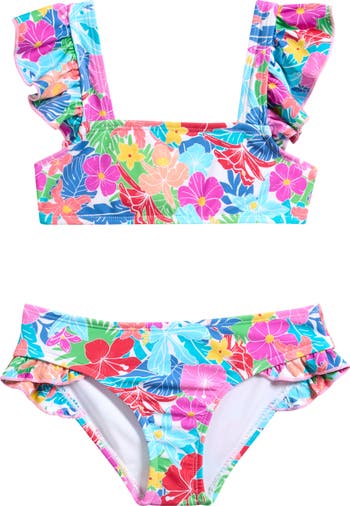 Frilly ruffles bring playful charm to this floral two-piece swimsuit that's sure to be a beach-day win your kid swimmer will love.