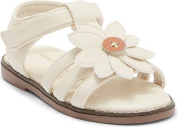 A pretty flower appliqué tops the straps of this adorable sandal made with an easy on/off strap and comfortable cushioning.