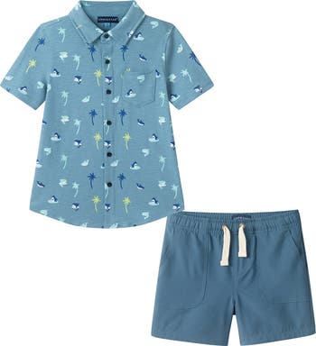 They will look polished and put-together, while staying extra comfy, in this stretch-knit set that pairs a button-up shirt with faux-drawstring shorts.