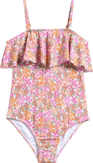 A ruffled layer brings playful charm to this floral one-piece swimsuit that's sure to be a beach-day win your kid swimmer will love.