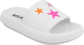 These shower-friendly slide sandals have a one-piece moulded EVA upper and a plush footbed that's soft and comfortable on tired little feet.