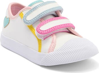 Keep little feet comfy in this rainbow-trimmed sneaker constructed with a durable cap toe, dual hook-and-loop straps and a grippy nonmarking sole.