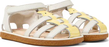 Color-pop birds are woven into the leather vamp of this whimsical sandal with kid-friendly features like a cushioned collar and an adjustable strap closure.