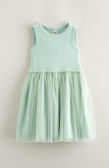 A floaty tulle skirt invites carefree twirling in this ballerina-inspired dress featuring a comfy cotton-forward ribbed tank bodice.