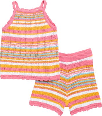 Add to your kiddo's warm-weather rotation with this darling open-stitched set pairing a striped tank with matching shorts.