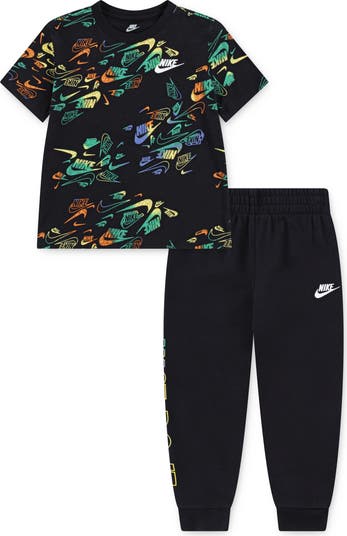 Give your kid sporty style with this all-over Swoosh printed T-shirt and joggers set constructed from comfy cotton.