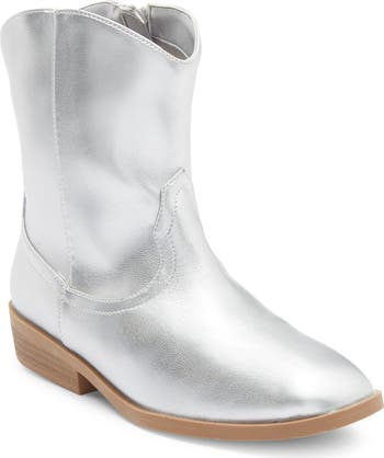 An uneven topline and stacked heel give a Western-inspired kick to this gleaming boot your little one is sure to take a shine to.