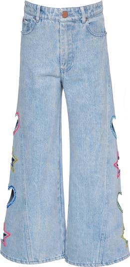 Elevate their denim collection with these wide-leg jeans that feature playful heart and star side cutouts adorned with colorful gems.