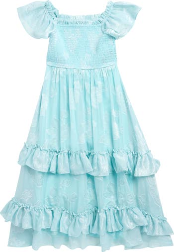 Ideal for sunny days and special occasions, this charming dress cut from floral burnout fabric and features a smocked bodice, tiered skirt and fluttery sleeves.
