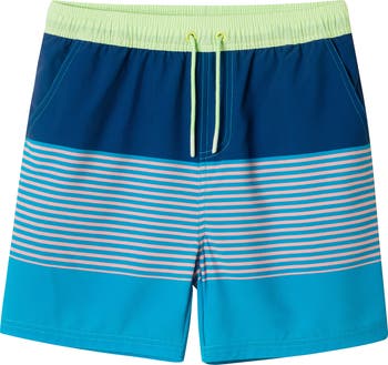 They'll have a blast while making a splash in these swim trunks that feature a fun striped pattern and comfortable elastic waistband.