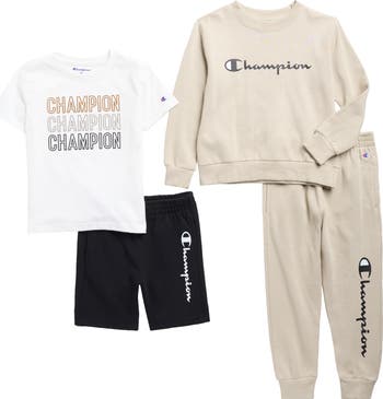 Give your kid sporty style with this coordinated four-piece set including a logo printed sweatshirt, pants, T-shirt and shorts.