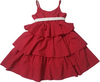 A contrasting ribbon defines the waist of a tiered party dress patterned in ditsy dots to bring whimsical flair to their look.