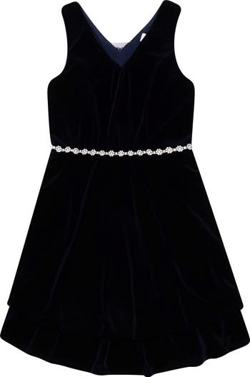 A sparkling jewel embellished chain brings a dazzling finish to this texture-rich velvet party dress.