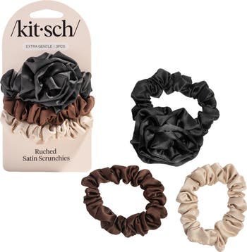 Soft satin is gentle on your tresses when you pull strands back with this trio of scrunchies that comes with two regular and one with a darling rosette attached.