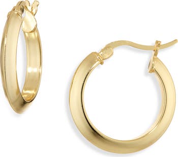 An angled silhouette catches the light on polished huggie hoop earrings boasting a high-shine finish.