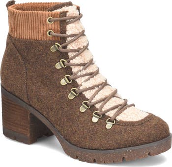 High-pile fleece trims further the coziness of a bootie lofted by a blocky heel and set on a lugged rubber sole for durability.