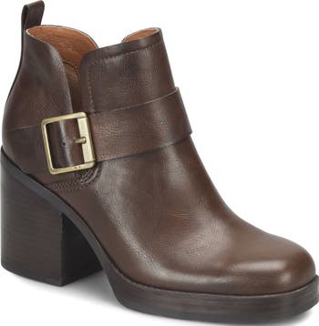 A square-toe bootie constructed from sleek faux leather features deeply notched sides, a buckle accent and stacked block heel for everyday style.