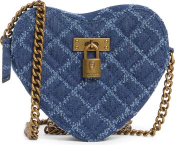 A signature eagle's head lock highlights the quilted denim exterior of a heart shaped crossbody bag suspended from an aged-finish chain-link strap.