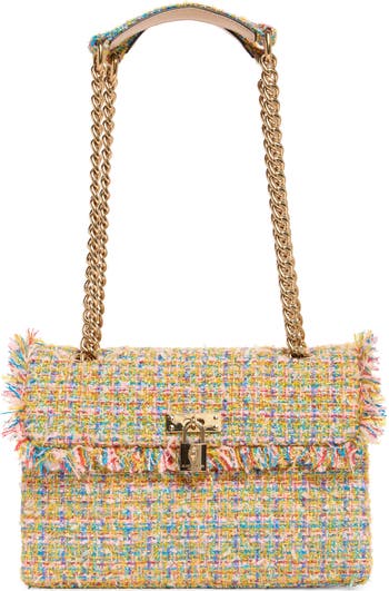 Colorful tweed and a signature padlock distinguish this classic shoulder bag furnished with an array of pockets and a equipped with a convertible chain strap for versatile wear.